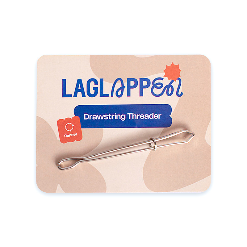 Mycket användbart verktyg som hjälper dig dra tillbaka snöret genom hoodien, gympabyxorna eller jackan. Nyp fast snöret, dra ringen uppåt så gapet på snördragaren låser sig och dra slutligen ut snöret.